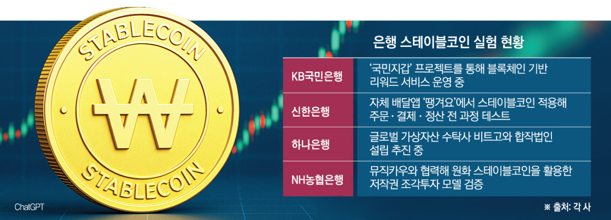 신한은행은 자체 배달 애플리케이션 '땡겨요'에 스테이블코인을 적용해 주문·결제·정산 과정을 테스트 중이다. KB국민은행은 '국민지갑' 프로젝트를 통해 블록체인 기반 리워드 서비스를 선행했다. 하나은행은 글로벌 가상자산 수탁사 비트고와 합작법인을 설립해 수탁업 진출을 준비하고 있다.