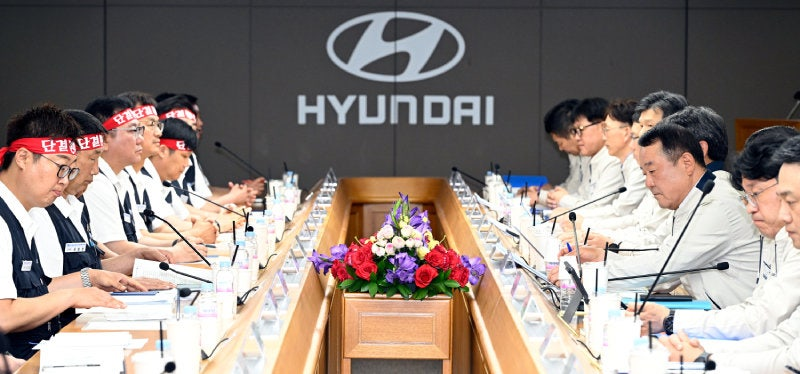 현대자동차 노사 관계자들이 지난 6월 18일 현대차 울산공장 본관에서 ‘2025년 임금 및 단체협상 교섭 상견례’를 하고 있다. [현대차 제공] |