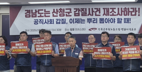 (산청·창원=연합뉴스) 정종호 기자 = 전국공무원노동조합 경남지역본부(이하 노조)는 27일 도청 프레스센터에서 기자회견을 열고 "최근 산청군에서 공직사회 근간을 흔드는 심각한 갑질 사건이 발생했다"며 "가해 공무원은 하루 만에 대기발령을 받은 걸 고려하면 사건이 엄중하고 중대하다"고 밝혔다.
