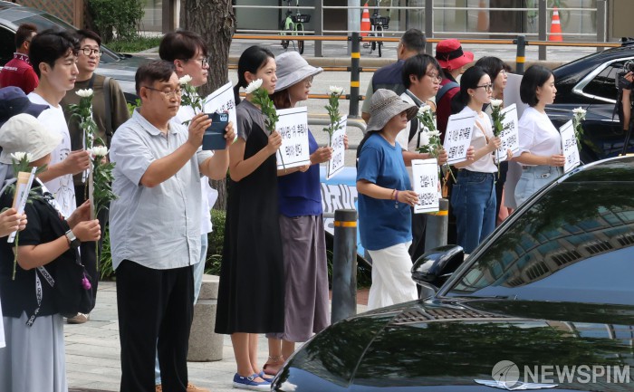 [서울=뉴스핌] 양윤모 기자 = 산업재해 유가족 등이 27일 오전 '2025 건설의 날' 기념식이 열리는 서울 강남구 건설회관 앞에서 손팻말 시위를 하고 있다. 2025.08.27 yym58@newspim.com