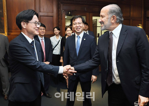 김정관 산업통상자원부 장관(왼쪽)과 하워드 러트닉 미국 상무장관(오른쪽)이 지난 24일(현지시간) 미국 워싱턴D.C. 상무부 회의실 앞에서 악수하고 있다. 여한구 산업부 통상교섭본부장(가운데)을 포함한 이들은 이날 협상을 진행한 후 하루 뒤 오후 러트닉 장관의 뉴욕 자택에서 추가 협상을 진행 중이다. (사진=산업부) |