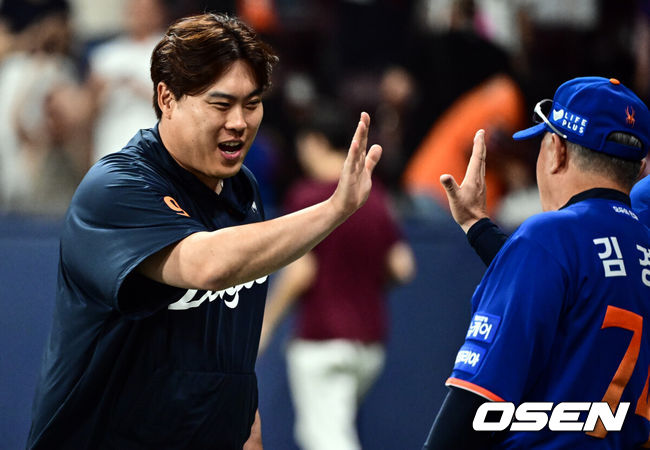 [OSEN=고척, 조은정 기자]프로야구 한화 이글스가 6연패 이후 3연승으로 반등하며 1위 싸움을 이어갔다.한화는 26일 서울 고척스카이돔에서 열린 2025 신한 SOL Bank KBO리그 키움 히어로즈와의 원정경기를 31로 승리했다.한화 류현진이 김경문 감독과 승리를 기뻐하고 있다. 2025.08.26 /cej@osen.co.kr |