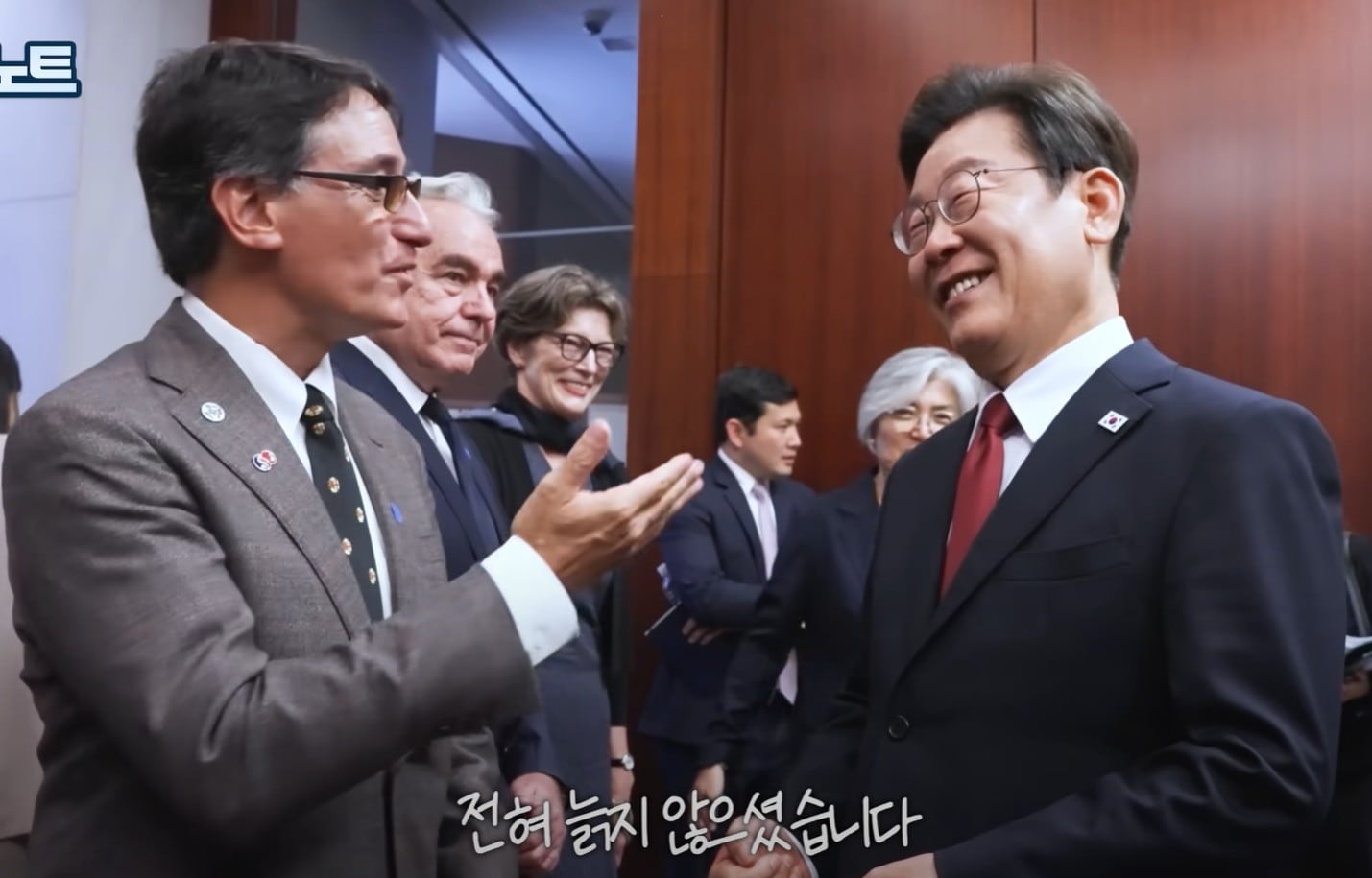 이재명 대통령(오른쪽)이 25일 워싱턴 DC의 싱크탱크인 전략국제문제연구소(CSIS)에서 프랭크 자누지 맨스필드재단 대표와 만나 대화를 하고 있다. /유튜브 |