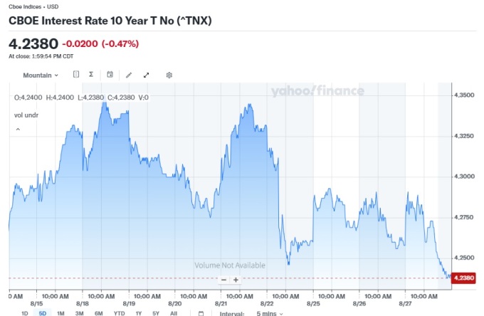 미 국채 10년물 금리 차트, 자료=야후 파이낸스, 2025.08.28 koinwon@newspim.com |