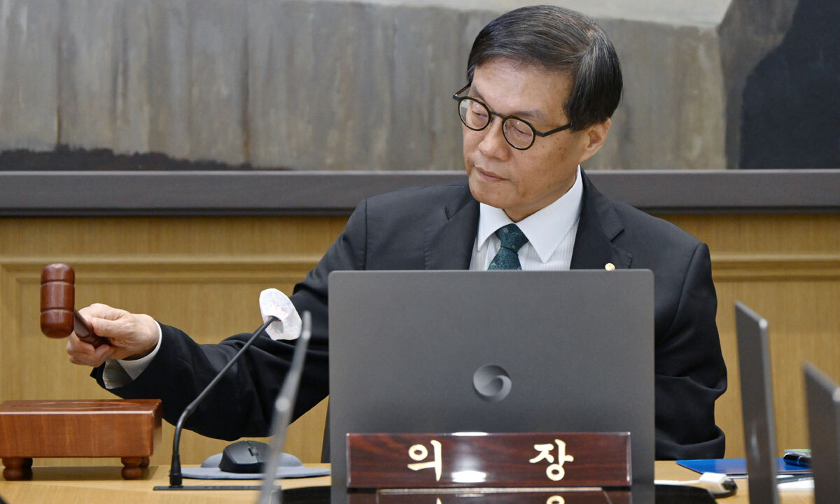 이창용 한국은행 총재가 28일 서울 중구 한국은행에서 열린 금융통화위원회에서 의사봉을 두드리고 있다. 뉴시스 |