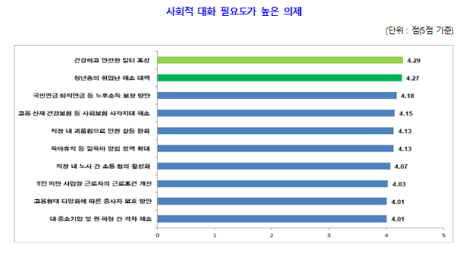 조사 결과, 사회적 대화 필요도가 가장 높게 꼽힌 의제는 ▷건강하고 안전한 일터 조성(4.29점) ▷청년층 취업난 해소 대책(4.27점)으로 나타났다. 이어 ▷국민연금·퇴직연금 등 노후소득 보장 방안(4.18점) ▷사회보험 사각지대 해소(4.15점) ▷직장 내 괴롭힘 완화(4.13점) 등이 뒤를 이었다.
