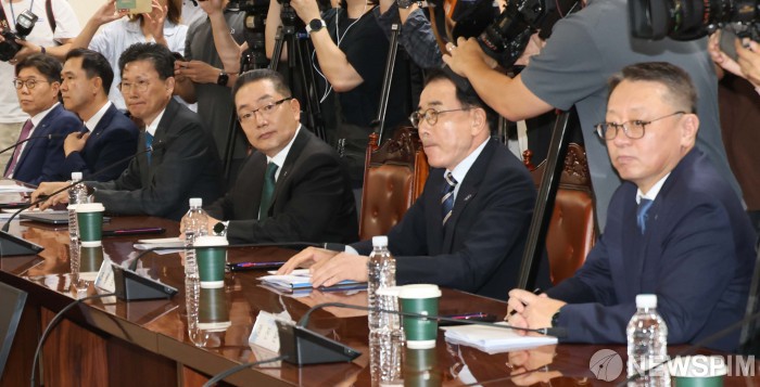 [서울=뉴스핌] 양윤모 기자 = 28일 오후 서울 중구 은행회관에서 이찬진 금융감독원장과 첫 국내 은행장 간담회이 취임 2주 만에 개최됐다. 이 자리에는 조용병 은행연합회장,이환주 KB국민은행장, 정상혁 신한은행장, 이호성 하나은행장, 정진완 우리은행장, 김성태 기업은행장, 강태영 NH농협은행장 등 시중은행과 지방은행,인터넷은행의 은행장이 참석했다. 2025.08.28 yym58@newspim.com
