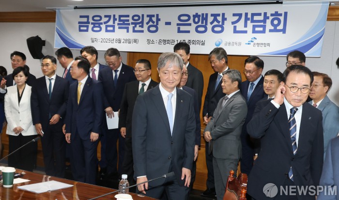 [서울=뉴스핌] 양윤모 기자 = 이찬진 금융감독원장이 취임 2주 만에 28일 오후 서울 중구 은행회관에서 개최된 첫 국내 은행장 간담회에 참석 기념촬영을 마치고 이동하고 있다. 이 자리에는 조용병 은행연합회장, 이환주 KB국민은행장, 정상혁 신한은행장, 이호성 하나은행장, 정진완 우리은행장, 김성태 기업은행장, 강태영 NH농협은행장 등 시중은행과 지방은행, 인터넷은행의 은행장이 참석했다. 2025.08.28 yym58@newspim.com