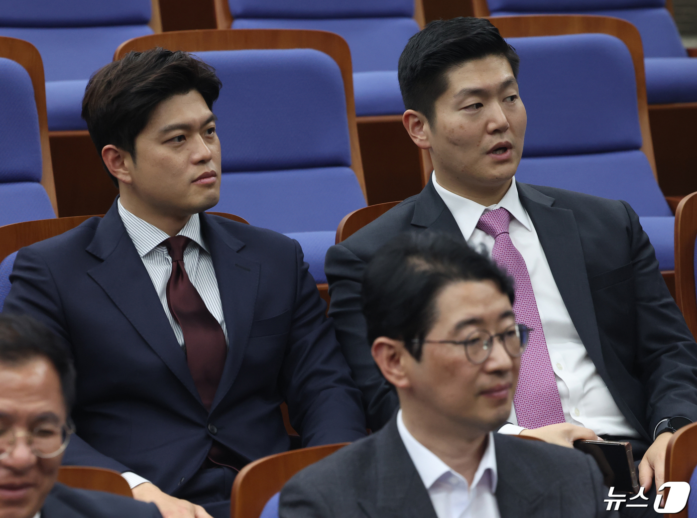 국민의힘 김재섭, 김용태 당선인이 22일 서울 여의도 국회에서 열린 제22대 국회의원 당선자총회에 참석하고 있다. 2024.4.22/뉴스1 ⓒ News1 ,송원영 기자 |