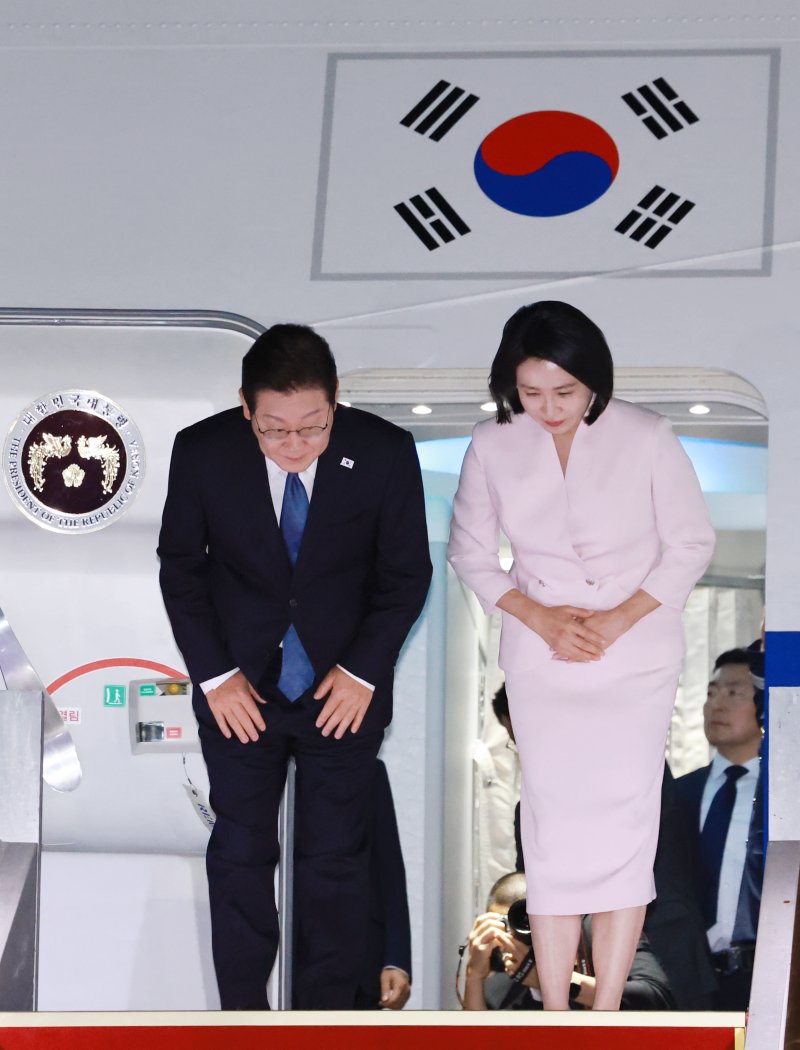 대통령 부부 귀국 인사이재명 대통령과 김혜경 여사가 일본·미국 방문 일정을 마치고 28일 경기도 성남 서울공항에 도착해 공군1호기에서 내리며 인사하고 있다. 연합뉴스 |