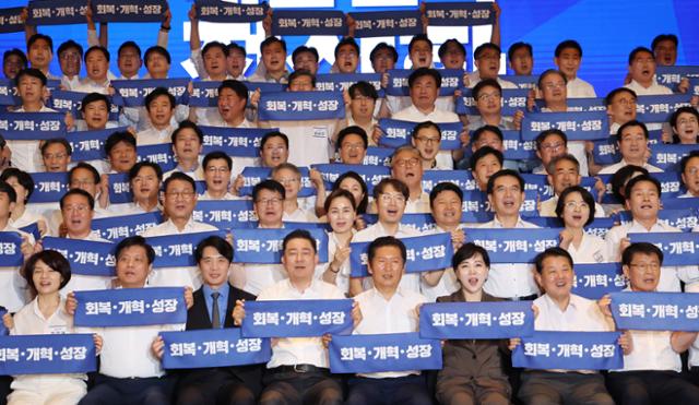 더불어민주당 의원들이 28일 인천 중구 파라다이스시티호텔 컨벤션센터에서 열린 2025 정기국회 국회의원 워크숍에서 손펼침막을 들고 구호를 외치고 있다. 고영권 기자 |