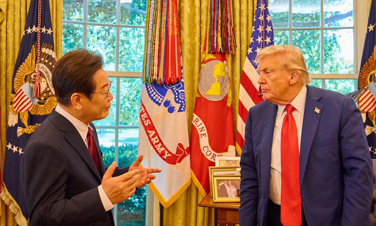 이재명 대통령이 25일(현지시간) 미국 워싱턴DC 백악관 오벌오피스에서 열린 한미 정상회담뒤 도널드 트럼프 미국 대통령과 대화하고 있다. 공동취재 |