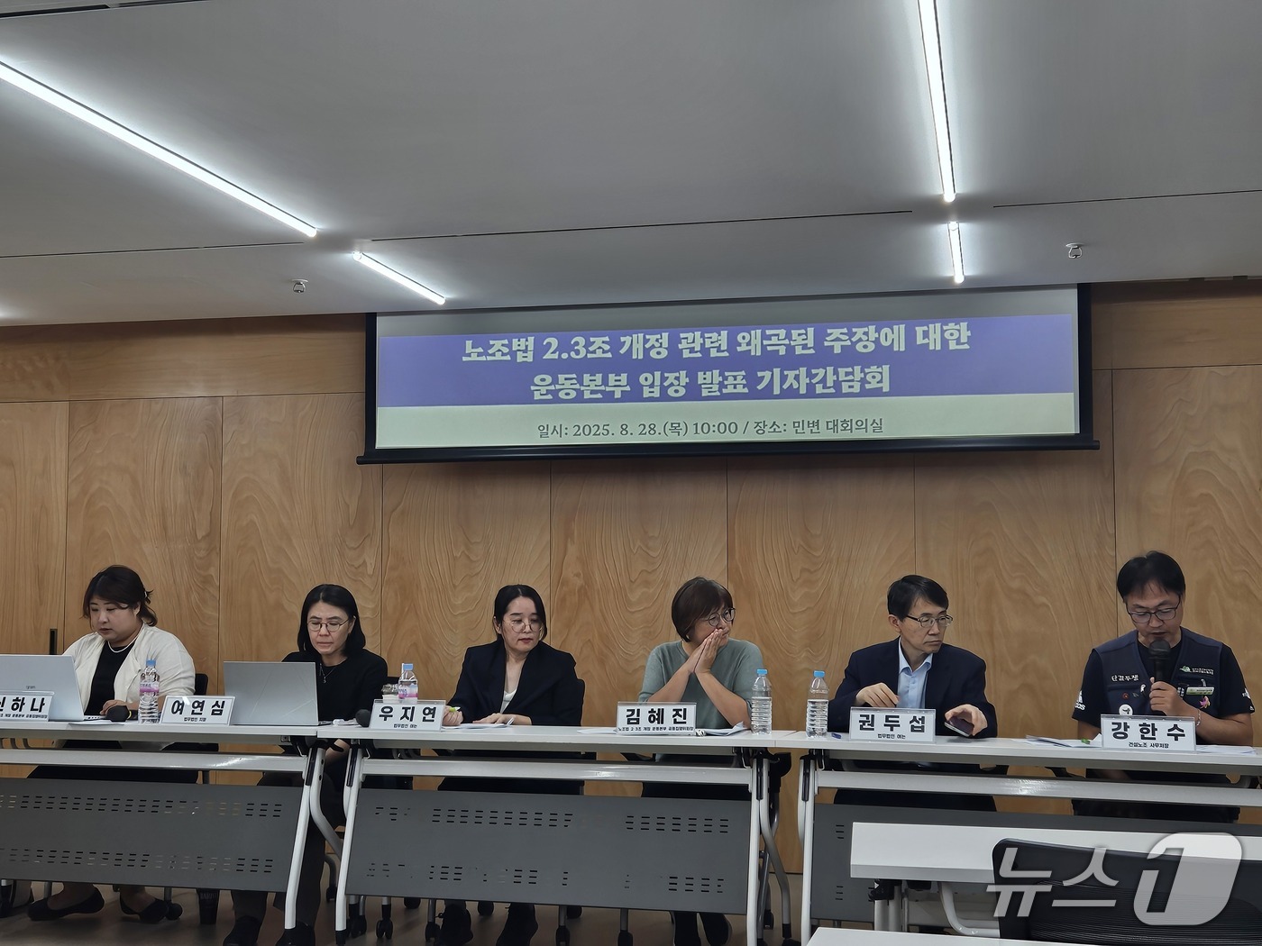 28일 오전 10시쯤 서울 서초구 민주사회를 위한 변호사모임(민변) 대회의실에서 노조법 2·3조 개정 운동본부가 기자간담회를 진행하고 있다. 2025.08.28/뉴스1 ⓒ News1 유채연 기자 |