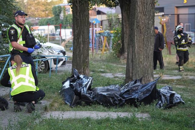 28일 우크라이나 키이우에서 경찰관들이 러시아의 공습으로 숨진 희생자 시신 주변을 조사하고 있다. 키이우=AP 뉴시스 |