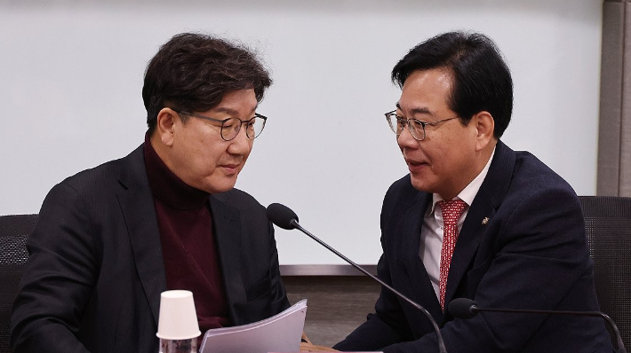 송 원내대표는 이날 자신의 페이스북에 "국회의원 연찬회가 진행 중인 가운데, 이재명 정권의 충견 민중기 특검팀이 우리 당 권성동 의원에 대한 구속영장을 기습 청구했다"며 이렇게 썼다.