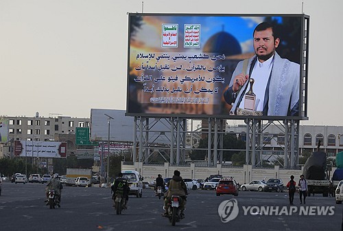 예멘 수도 사나의 후티 지도자 간판 |