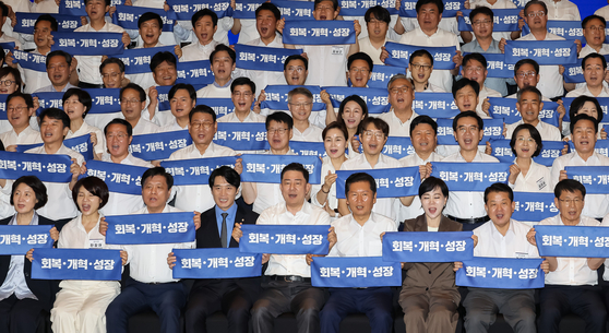 정청래 대표(앞줄 오른쪽 넷째) 등 더불어민주당 의원들이 28일 열린 워크숍에서 구호를 외치고 있다. 전민규 기자 |