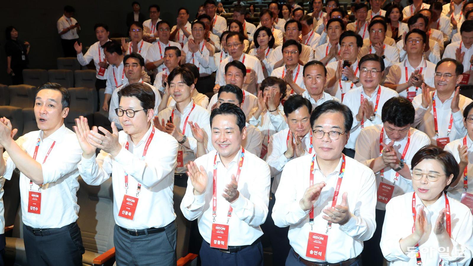 28일 오후 인천 중구 인천국제공항공사 항공교육원에서 열린 국민의힘 의원 연찬회에서 장동혁 대표(앞줄 가운데)와 송언석 원내대표(앞줄 오른쪽에서 두 번째)를 비롯한 참석자들이 박수를 치고 있다. 장 대표는 “이재명 정권과 싸우기 위해 전쟁터로 나가는 출정식이 됐으면 좋겠다”고 말했다. 인천=장승윤 기자 tomato99@donga.com |