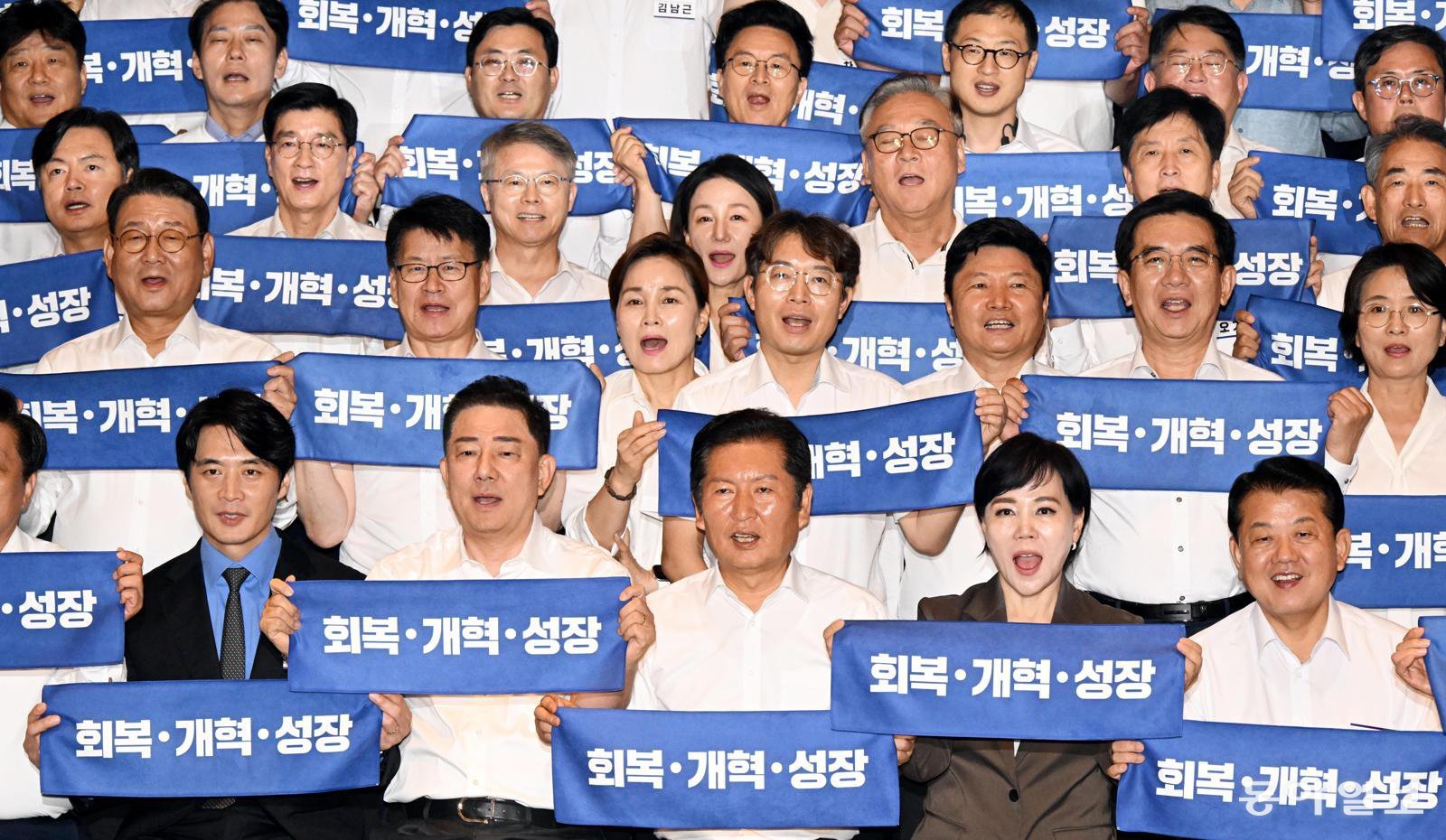 28일 오후 인천 중구 파라다이스시티 컨벤션센터에서 열린 의원 워크숍에서 더불어민주당 정청래 대표(앞줄 가운데)와 김병기 원내대표(앞줄 왼쪽에서 두 번째)를 비롯한 참석자들이 파이팅을 외치고 있다. 정 대표는 “당·정·대는 원팀, 원보이스로 굳게 단결해서 함께 나아가야 한다”고 말했다. 인천=이훈구 기자 ufo@donga.com |