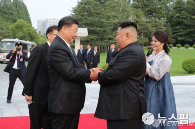 [서울=뉴스핌] 2019년 6월 조선로동당 중앙위원회 본부청사에서 김정은 북한 국무위원장 및 시진핑 중국 국가주석 내외가 기념촬영에 앞서 인사를 하고 있다. [사진=노동신문]2019.06.21.photo@newspim.com |