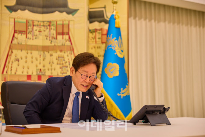 이재명 대통령이 28일 서울 한남동 관저에서 에모말리 라흐몬 타지키스탄 대통령과 통화하고 있다.(사진=뉴시스) |