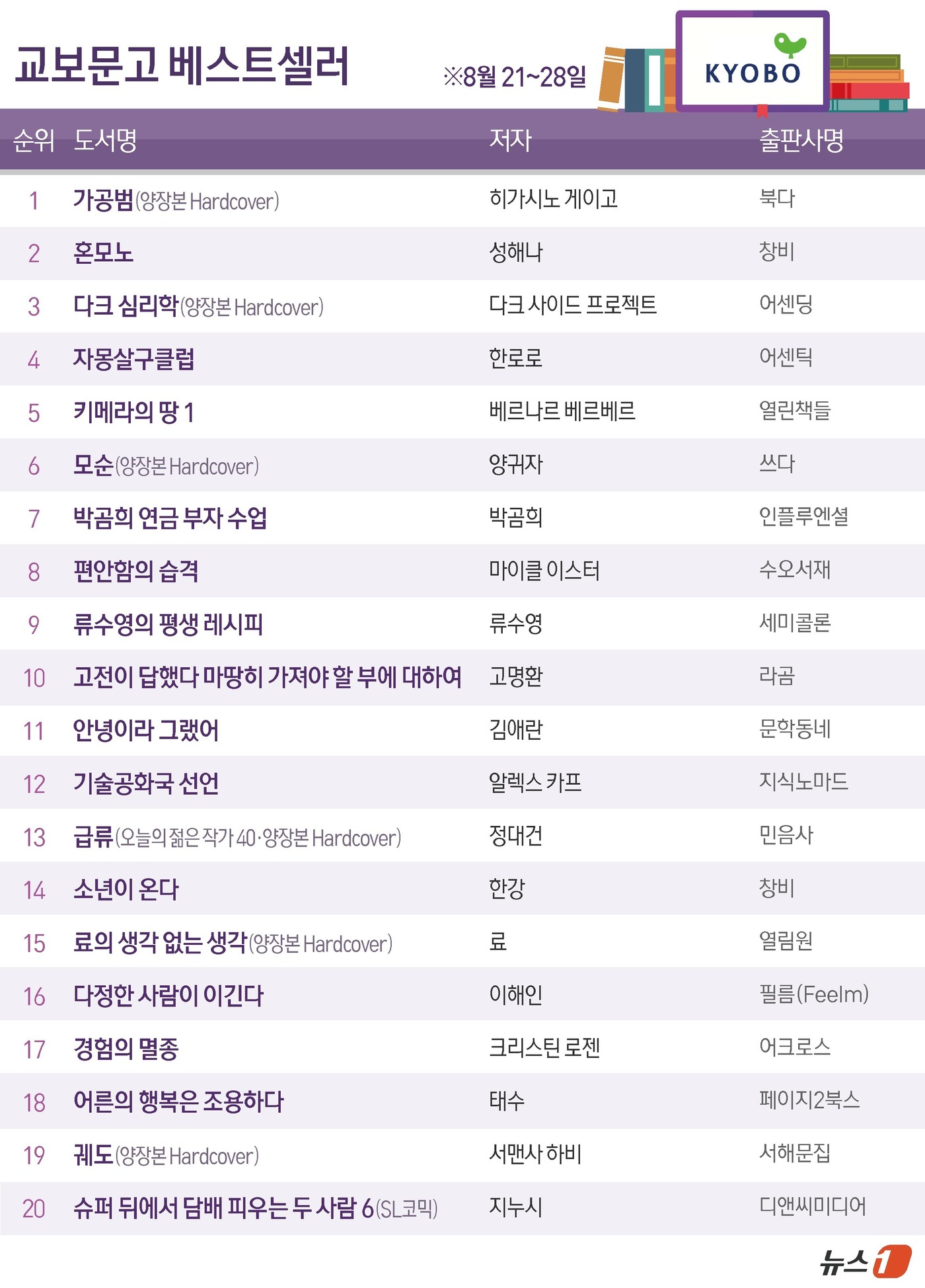 교보문고 최신 주간(8월 21~28일) 종합 베스트셀러