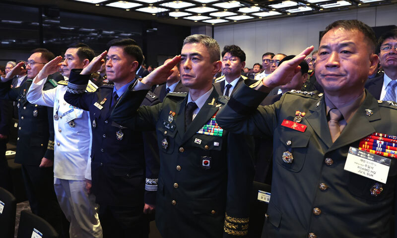 고창준(왼쪽부터) 육군참모총장 직무대리, 양용모 해군참모총장, 이영수 공군참모총장, 강신철 한미연합군사령부 부사령관, 주일석 해병대 사령관이 7월 8일 제1회 방위산업의 날 기념식에 참석한 모습. 뉴시스 |