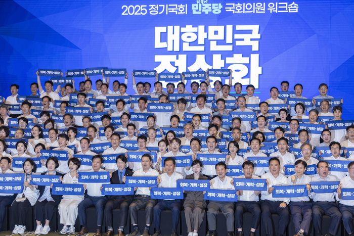 정청래 민주당 대표는 29일 인천 영종도 파라다이스시티 컨벤션센터에서 열린 2025 민주당 국회의원 워크숍 이틀차 일정에서 “개혁완수·민생안정이라는 두 마리 토끼를 잡기 위해 1박 2일 동안 치열하게 토론했다. 당정대 원팀, 원보이스로 이재명 정부를 반드시 성공시켜야 한다는 시대적 사명감으로 한마음 한뜻으로 결의했다”고 말했다.