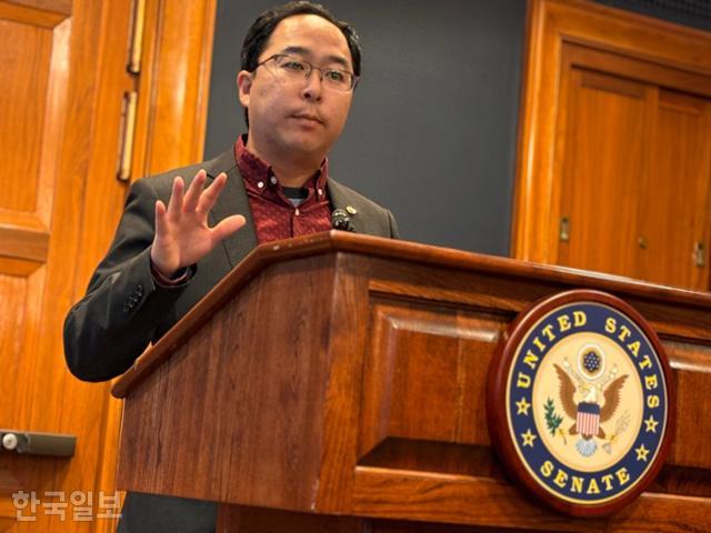 앤디 김 미국 연방 상원의원이 28일 미 워싱턴 덕슨 상원의원 회관에서 한국 특파원들을 대상으로 간담회를 하고 있다. 워싱턴=권경성 특파원 |