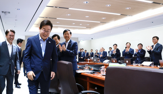 이재명 대통령이 29일 서울 용산 대통령실 청사에서 열린 임시 국무회의에 국무위원들의 기립박수를 받으며 입장하고 있다./ 연합뉴스 |