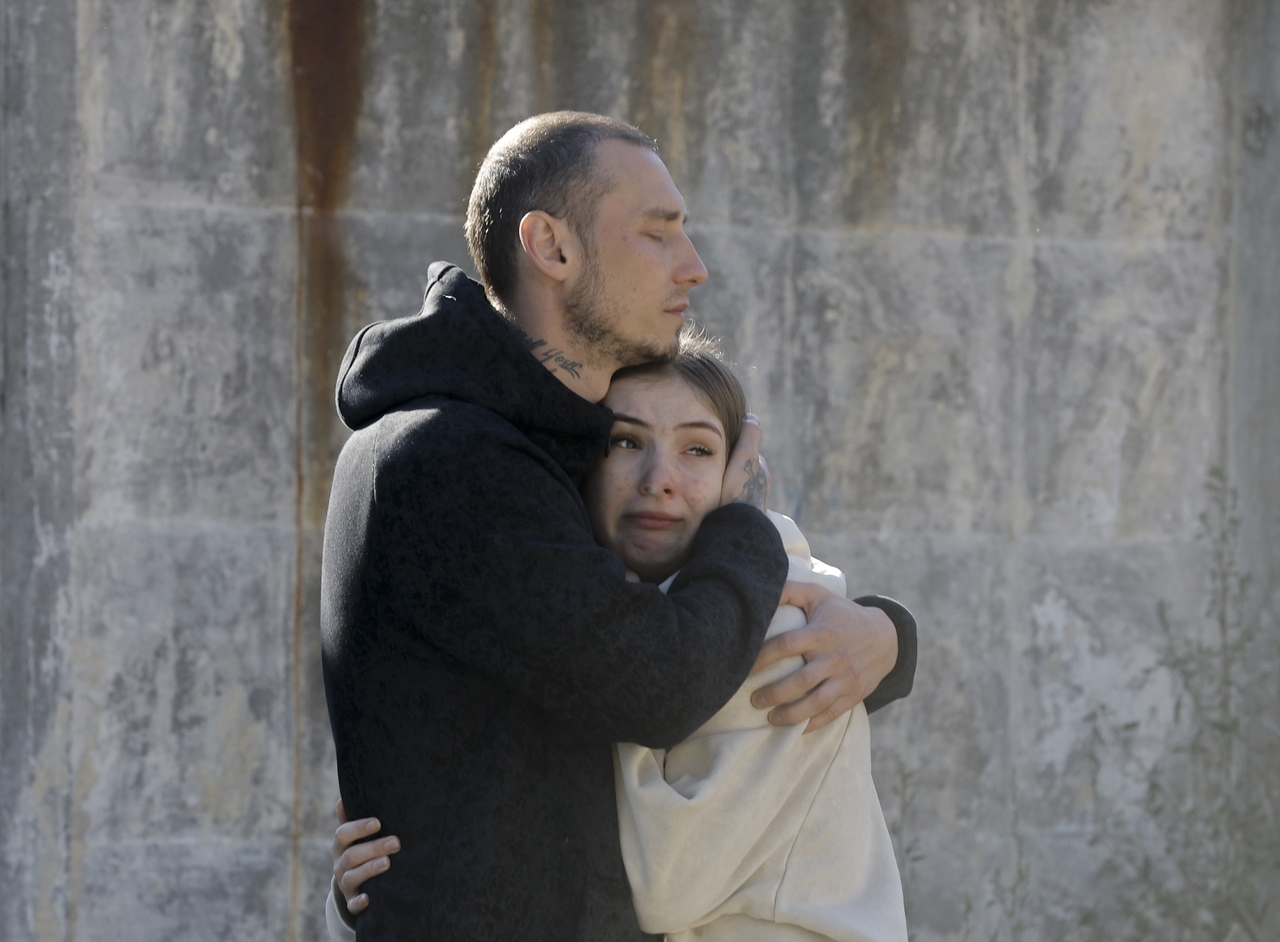 우크라이나 수도 키이우가 28일(현지시간) 러시아군에 폭격당하자 한 쌍의 남녀가 야외에서 잔해를 바라보며 슬퍼하고 있다. [EPA] |