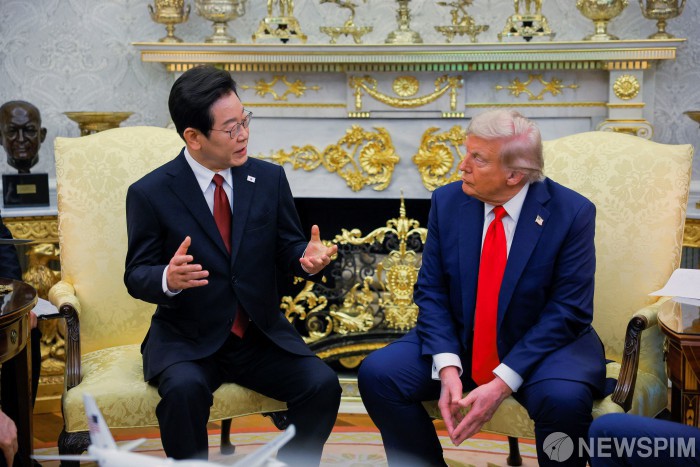 [워싱턴 로이터=뉴스핌] 이재명 대통령이 25일(현지시간) 미국 워싱턴 D.C. 백악관에서 도널드 트럼프 대통령과 정상회담을 하고 있다. 2025.08.26 photo@newspim.com |