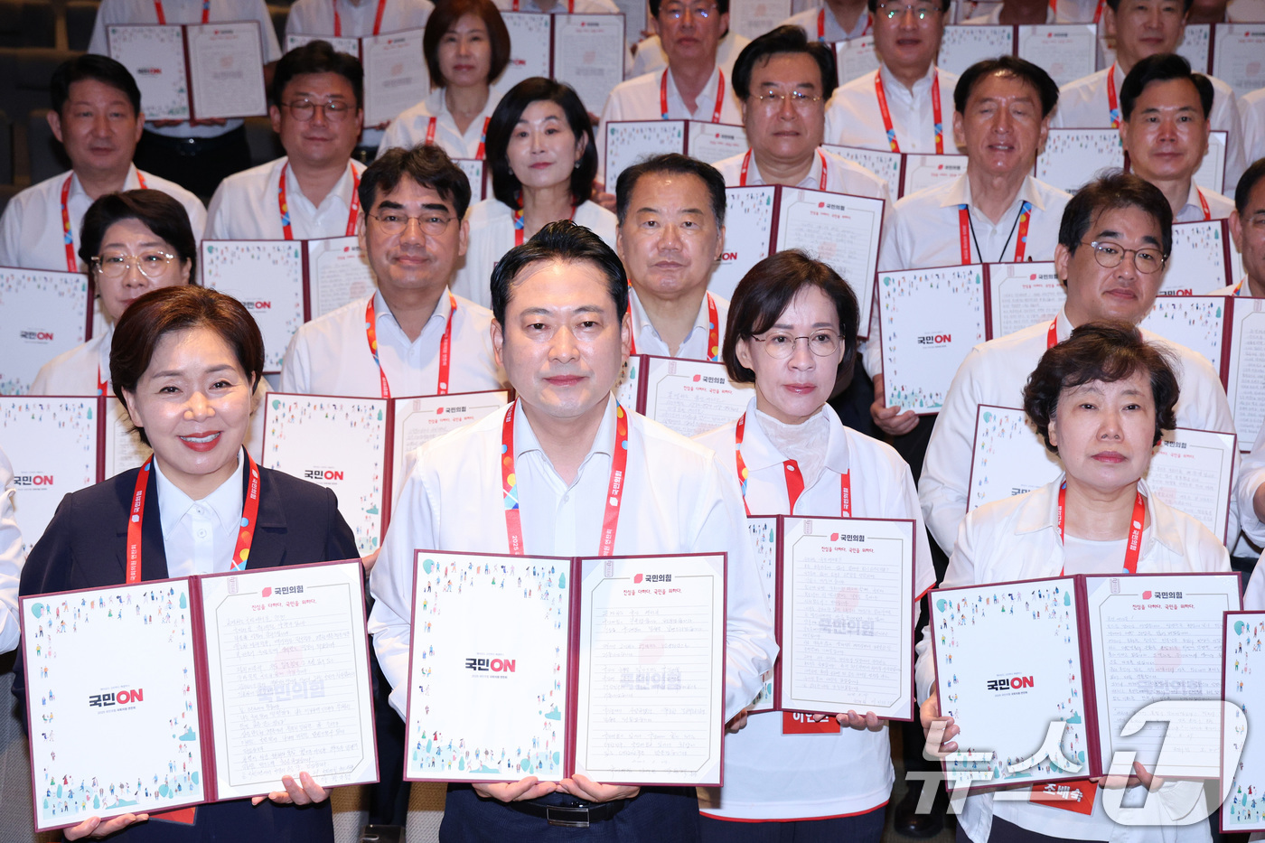 장동혁 대표를 비롯한 국민의힘 의원들이 29일 오전 인천 중구 인천국제공항공사 인재개발원에서 열린 국민의힘 연찬회에서 국민께 드리는 손편지를 공개하고 있다. 2025.8.29/뉴스1 ⓒ News1 신웅수 기자 |