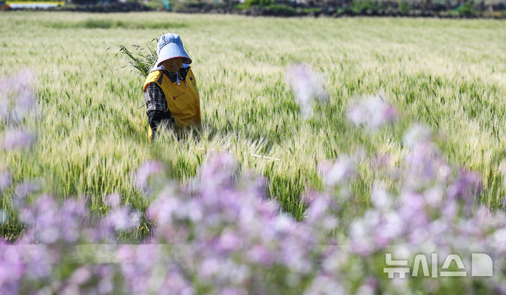 [제주=뉴시스] 우장호 기자 = 맑은 날씨를 보인 지난 4월24일 오전 제주시 내도동의 한 보리밭에서 농민이 김매기를 하고 있다. 2025.04.24. woo1223@newsis.com |