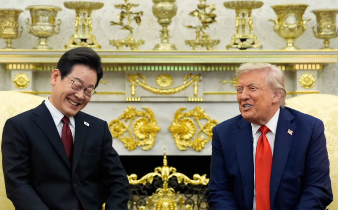 도널드 트럼프 미국 대통령(오른쪽)과 이재명 대통령이 25일 백악관에서 정상회담을 하고 있다. (사진=AP 연합뉴스) |