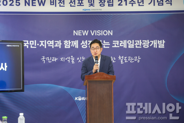 ▲권백신 코레일관광개발 사장이 2025 NEW 비전 선포 및 창립 21주년 기념사를 하고 있다. ⓒ 코레일관광개발 |