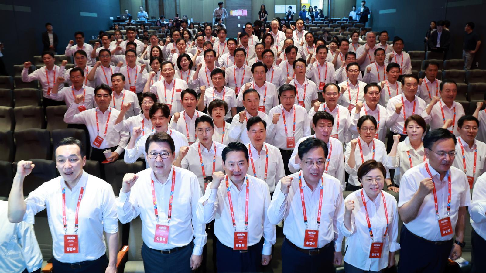장동혁 국민의힘 대표를 비롯한 의원들이 28일 오후 인천 중구 인천국제공항공사 항공교육원에서 열린 2025 국민의힘 국회의원 연찬회에서 슬로건을 외치며 기념촬영을 하고 있다. 2025.08.28. 뉴시스 |