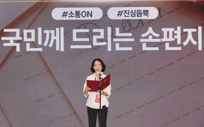 29일 인천국제공항공사 항공교육원에서 열린 2025 국민의힘 국회의원 연찬회에서 최수진 의원이 '국민께 드리는 손 편지'를 낭독하고 있다./연합뉴스 |