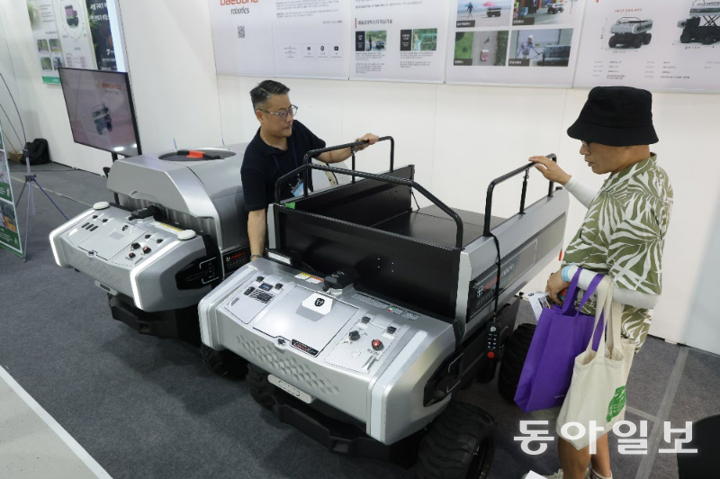 29일 ‘2025 에이팜쇼’에 마련된 대동로보틱스의 운반로봇을 본 관람객들의 발길이 멈췄다. 자동차와 흡사한 로봇의 외관이 눈길을 끈 것이다. “운반로봇의 짐 싣는 곳을 늘릴 수 있냐” “더 큰 크기의 방제로봇을 만들고 있다니 신기하다” 등 곳곳에서 관람객들의 질문과 탄성이 이어졌다.