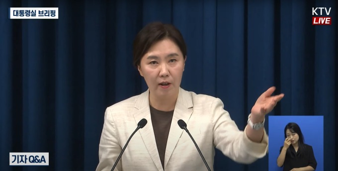 강유정 대통령실 대변인이 29일 오후 용산 대통령실에서 언론 브리핑을 하고 있다. [사진=KTV] |