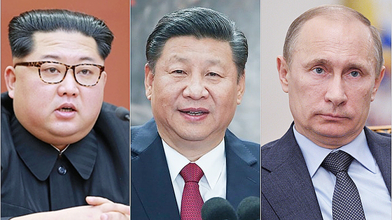 왼쪽부터 김정은 북한 국무위원장, 시진핑(習近平) 중국 국가주석, 블라디미르 푸틴 러시아 대통령. 중앙포토 |