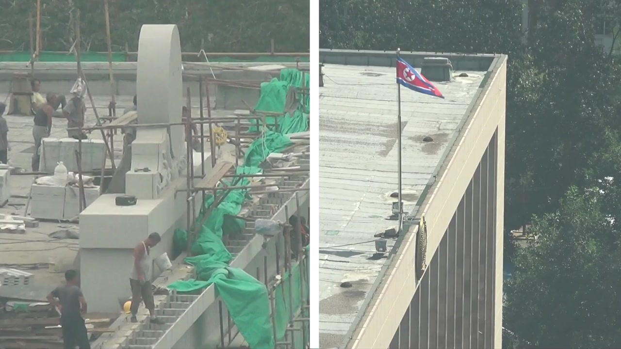 김정은 위원장의 중국 열병식 참석을 앞두고 베이징에 있는 북한 대사관이 대대적인 보수 공사를 벌이는 장면이 YTN 카메라에 포착됐습니다.