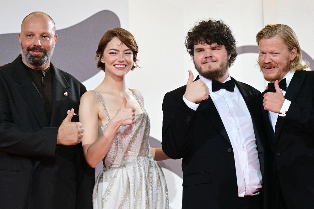 지난 28일(현지시간) 베네치아영화제 '부고니아' 월드 프리미어 상영에 참석한 요르고스 란티모스 감독, 배우 에마 스톤·에이든 델비스·제시 플레먼스(왼쪽부터). AFP연합뉴스 |