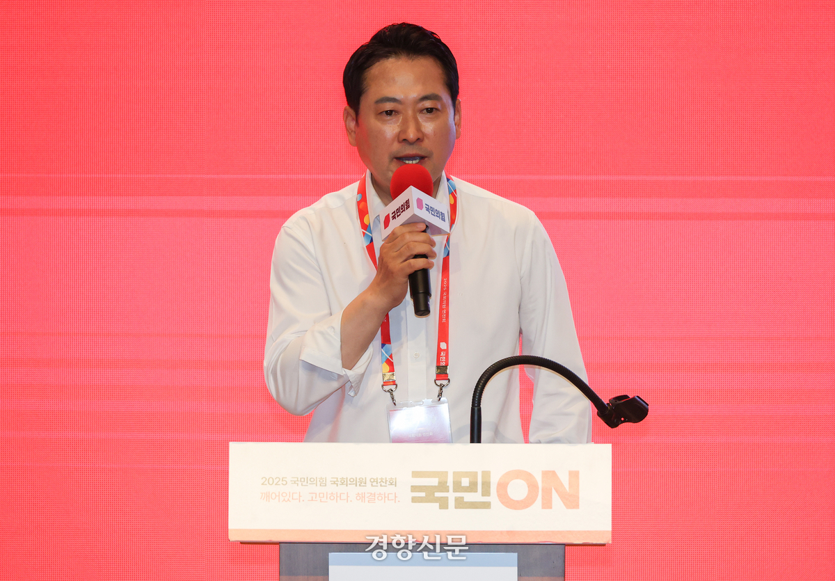 인천 영종도 인천국제공항공사 항공교육원에서 28일 열린 2025 국민의힘 국회의원 연찬회에서 장동혁 국민의힘 대표가 인사말을 하고 있다. 권도현 기자 |