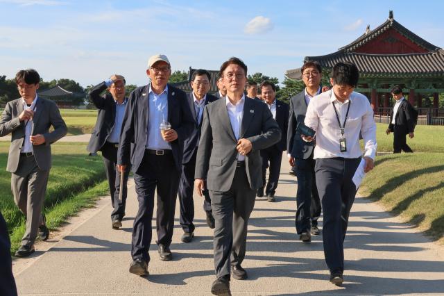 김민석 국무총리가 29일 경북 경주시 동궁과 월지를 찾아 APEC 참가자 관광 프로그램 준비 현황을 보고 받은 뒤 유홍준 국립중앙박물관장, 최휘영 문화체육관광부 장관 등과 둘러보고 있다. [사진=연합뉴스] |