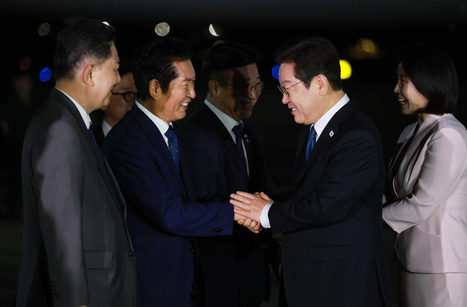 일본·미국 순방 일정을 마치고 귀국한 이재명 대통령이 28일 경기 성남 서울공항에서 정청래 더불어민주당 대표와 악수하고 있다. 2025.08.28 [성남=뉴시스] |