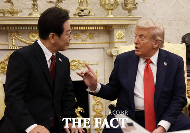 이재명 대통령과 도널드 트럼프 미국 대통령이 25일(현지 시간) 미국 워싱턴DC 백악관에서 한미 정상회담을 하고 있다. /워싱턴=뉴시스 |