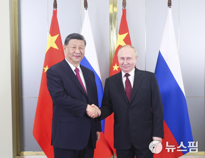 시진핑 중국 국가주석과 블라디미르 푸틴 러시아 대통령이 지난해 7월 카자흐스탄 아스타나에서 만나 악수를 나누고 있다. [신화사=뉴스핌 특약] |