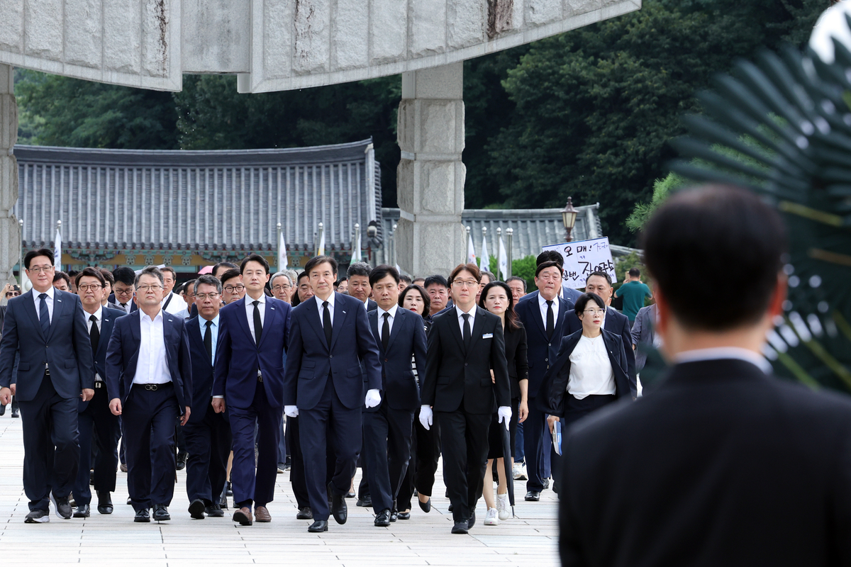 조국 조국혁신당 혁신정책연구원장이 지난 8월 26일 광주 국립5·18민주묘지를 찾아 당원들과 참배하기 위해 이동하고 있다. 연합뉴스 |