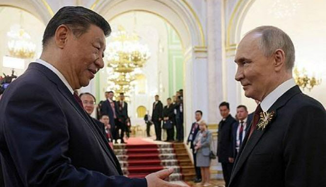 지난 5월 모스크바 크렘린궁에서 만난 시진핑(왼쪽)과 블라디미르 푸틴.(사진=연합뉴스) |
